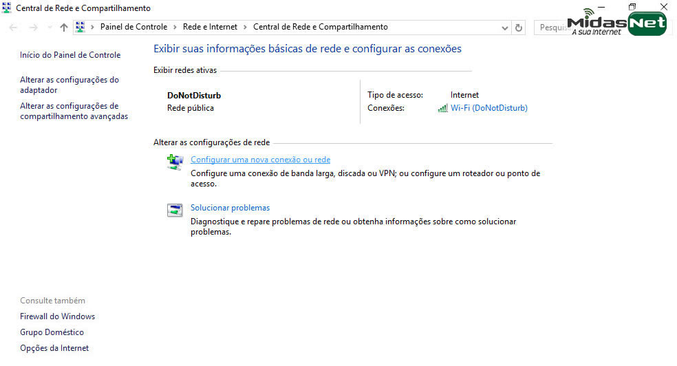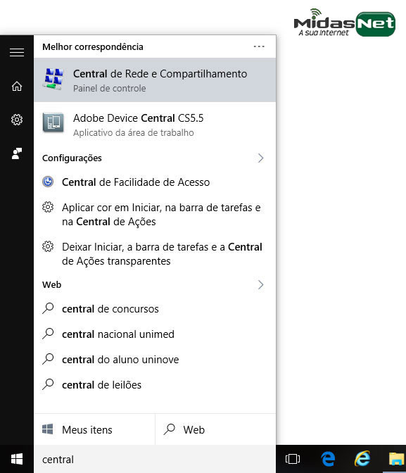na sequência, Central de Redes e Compartilhamento, clicando sobre o mesmo