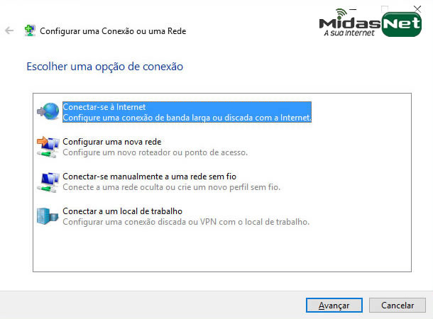 na tela adicional exibida, localize e clique na opção Conectar-se à Internet e em seguida, clique no botão Avançar