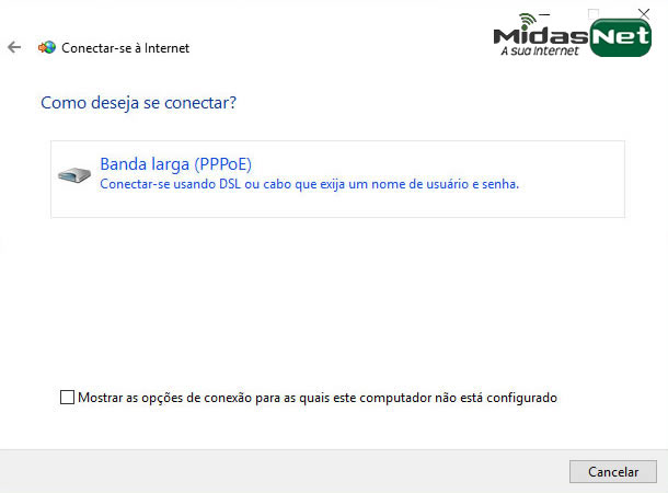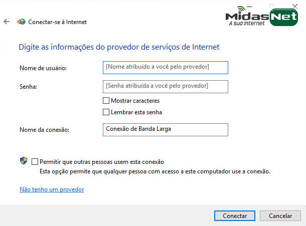 insira o Nome de usuário e Senha disponibilizados, caso ainda não tenha, entre em contato conosco solicitando, e também insira o Nome da conexão, "Midasnet", no exemplo acima está preenchido com "Conexão de Banda Larga", previamente inserido, só realizar a substituição, e logo após, clique em Conectar