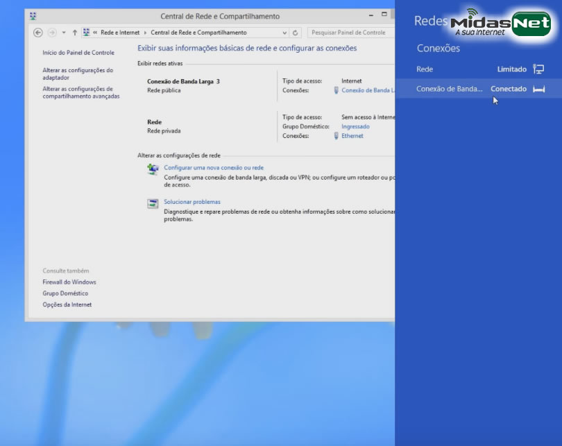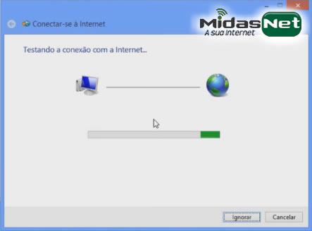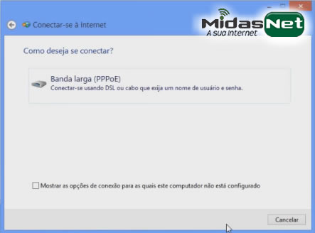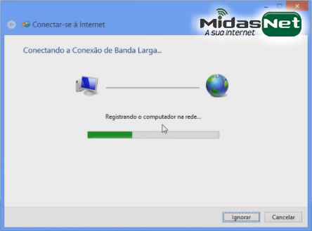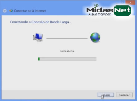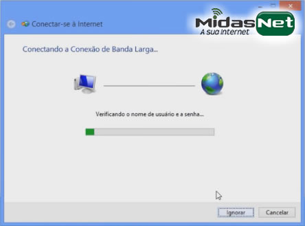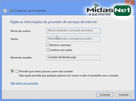 insira o Nome de usuário e Senha disponibilizados, caso ainda não tenha, entre em contato conosco solicitando, e também insira o Nome da conexão, "Midasnet", no exemplo acima está preenchido com "Conexão de Banda Larga", previamente inserido, só realizar a substituição, e logo após, clique em Conectar